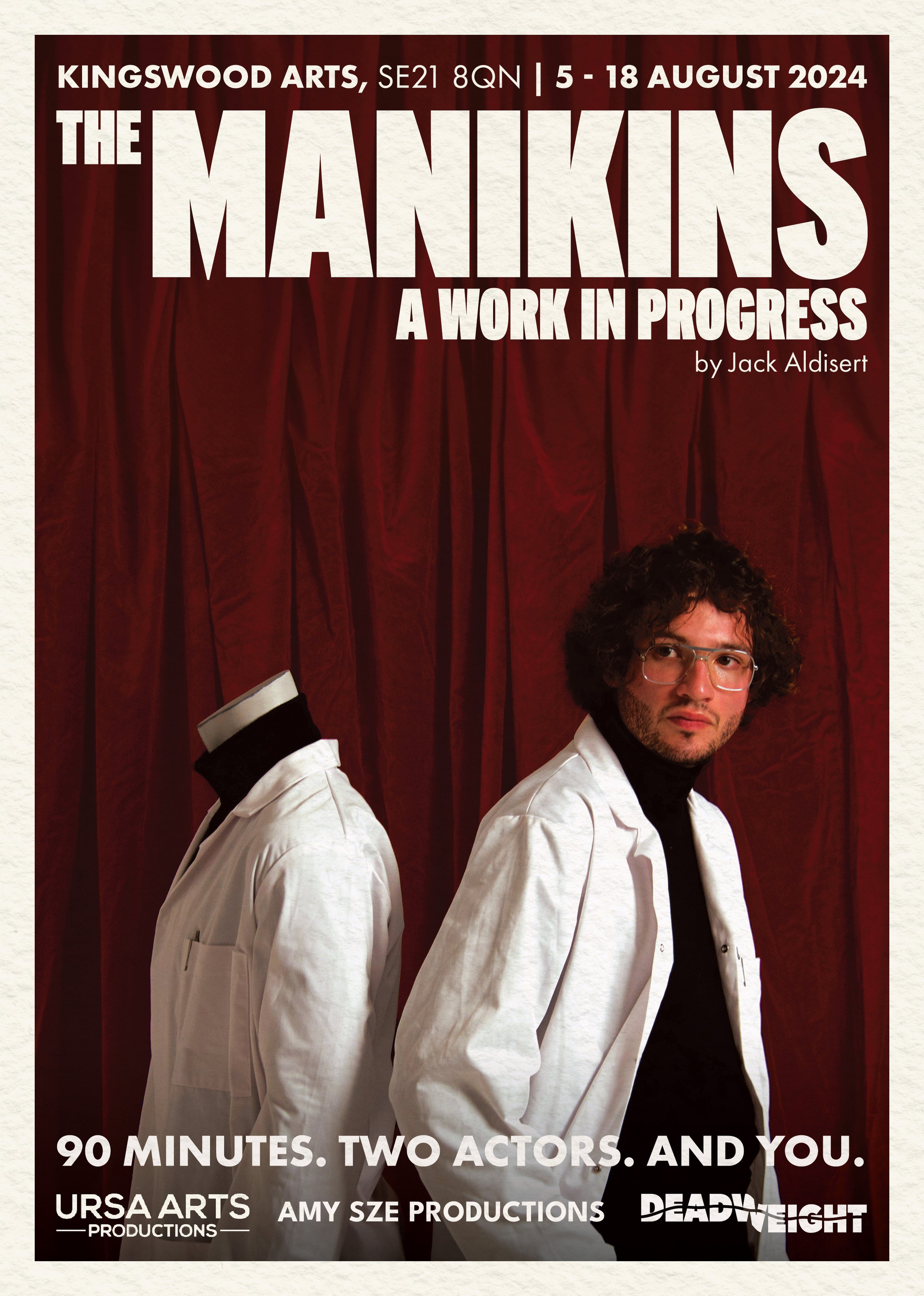 A ninety-minute performance by two actors for you, its single audience member and protagonist. The Manikins: a work in progress is a labyrinthine conspiracy, a cold war between dream and reality, a constantly transforming psychedelic world that slips like sand between your fingers.